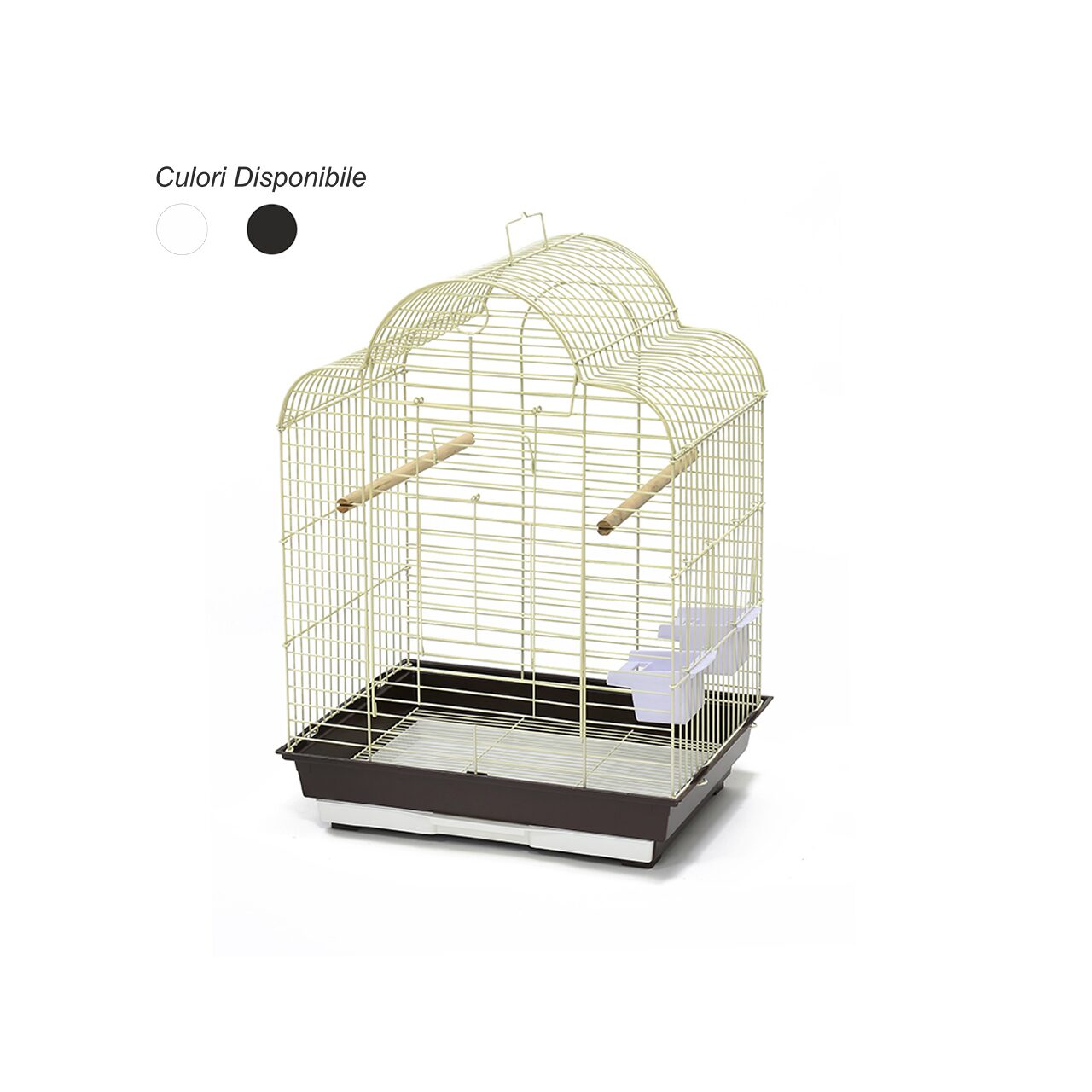 Fabricată cu gratii de culoare albă. Baza are o tăviţă de plastic detaşabilă pentru îngrijirea şi curăţarea uşoară a coliviei. Prevazută cu mâner de prindere, bețe, adăpător și hrănitor.