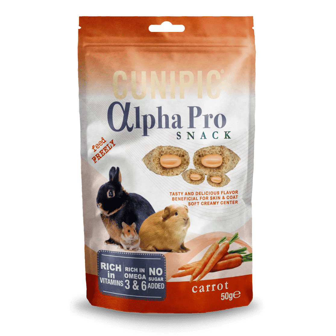 CUNIPIC Alpha Pro Morcov 50g este o hrana complementara pentru iepuri si rozatoare. Caracteristici Snack CUNIPIC Alpha Pro Morcov 50g: Hrana contine mai putine grasimi. CUNIPIC Alpha Pro Morcov 50g contine cantitatea ideala de grasimi, ce provin din surse bogate in aicizi omega 3 si omega 6. CUNIPIC Alpha Pro Morcov 50g sunt crocante la exterior si au umplutura cu crema de morcovi in interior. Nu contine conservanti si nu exista coloranti artificiali.