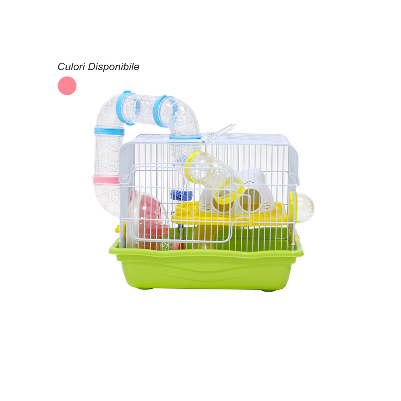 Cușcă din plastic și metal pentru hamsteri, cu accesorii și tub extern. Accesoriile viu colorate cu care este echipată cușcă satisfac nevoia de joacă a hamsterului iar tăvița adâncă împiedică împrăștierea rumegușului și ajută la păstrarea curățeniei.