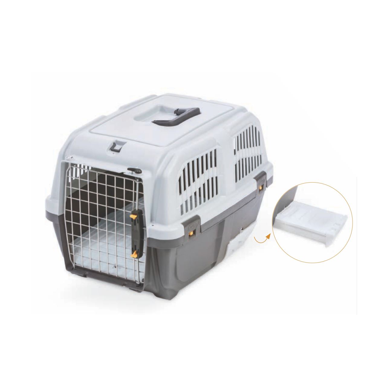 Prevăzută cu sistem de închidere metalic și grile de aerisire, ce asigură o bună ventilație în timpul transportului. În partea de jos are un compartiment pentru nisip cu capac. Ușă metalică cu blocare de siguranță, potrivită pentru câini și pisici, ideală și pentru sejururi la hoteluri sau expoziții.