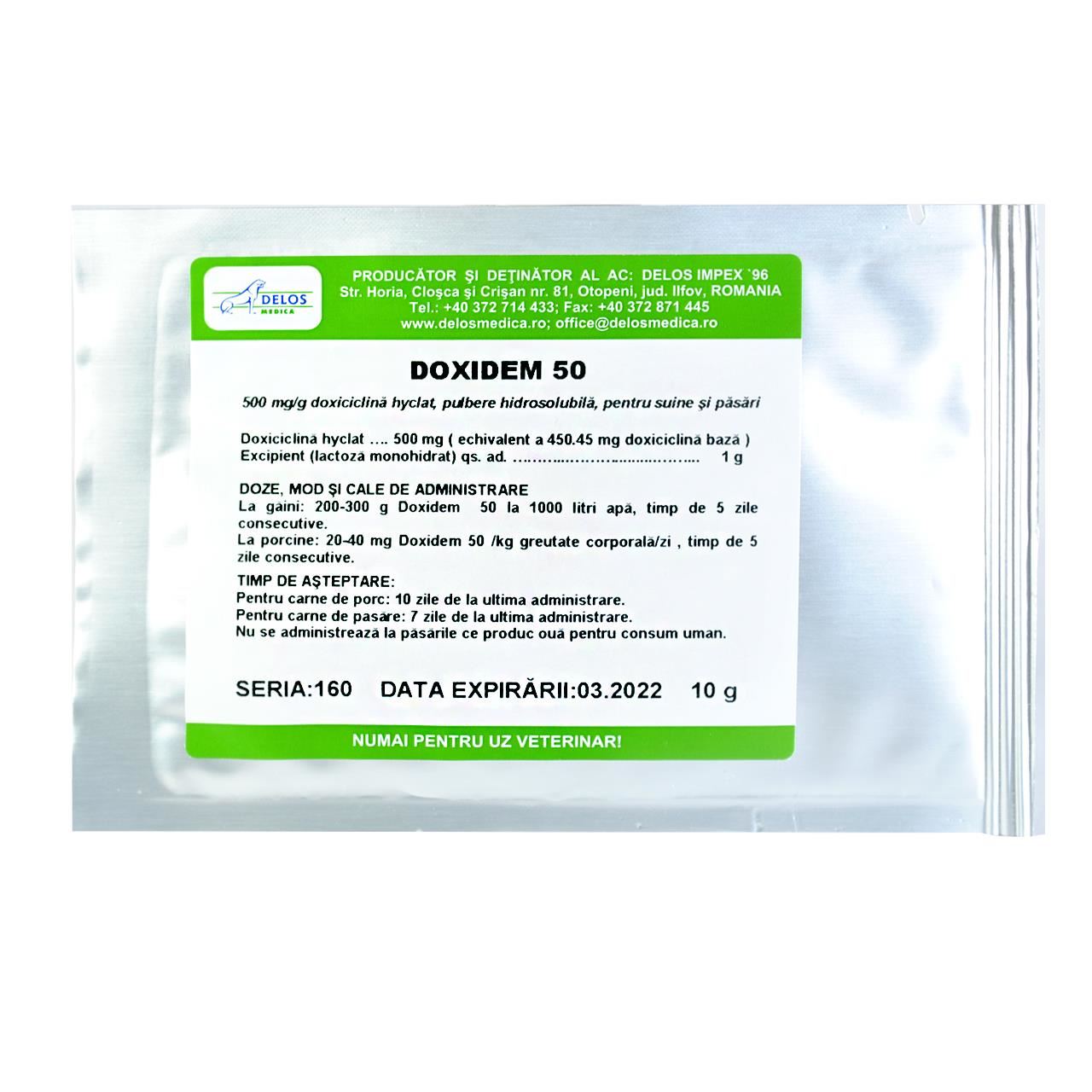 La pasari: administrat per os, doza terapeutica este de 20-40 mg Doxidem 50 /kg greutate vie/zi (10-20 mg doxiciclina /kg greutate vie/zi), timp de 5 zile consecutive.