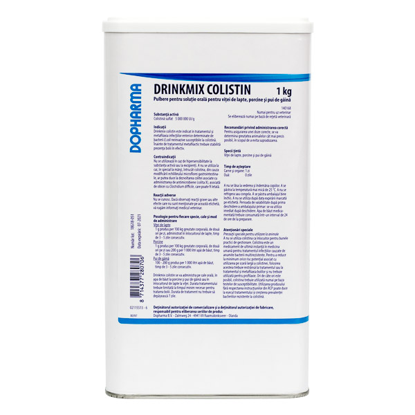 DRINKMIX COLISTIN este indicat in tratamentul si metafilaxia infectiilor enterice determinate de bacterii E.coli neinvazive susceptibile la colistina.Inainte de tratamentul metafilaciic trebuie stabilita prezenta bolii in efectiv.