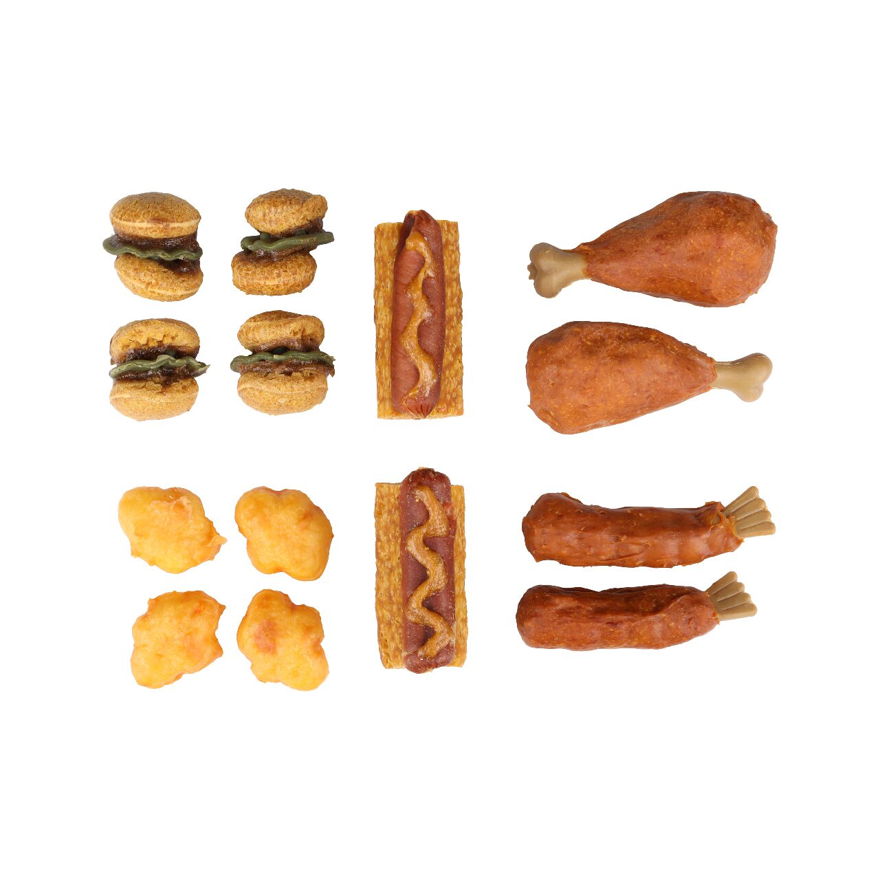 Conține 4 nuggets, 2 bucăți de pui tip ”crevete”, 4 mini burgeri, 2 pulpe de pui și 2 hot dog.