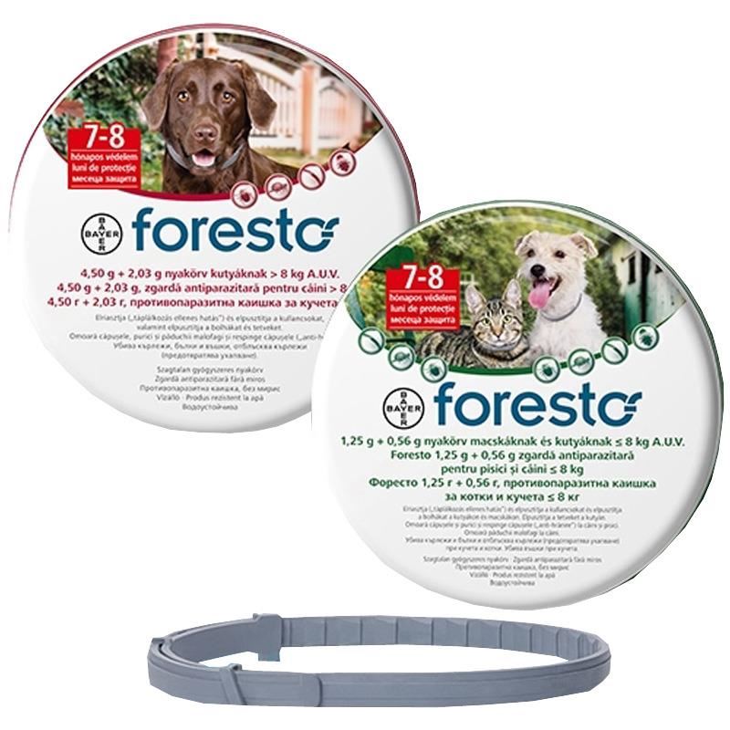 Câinii peste 8 kg primesc o zgardă Foresto antiparazitară pentru câini > 8 kg cu lungimea de 70 cm.