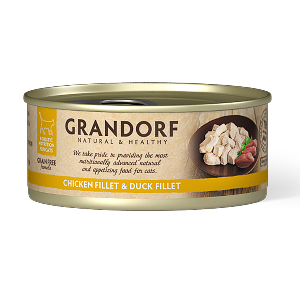 Hrană umedă, complet naturală, din file din carne de pui și rață. Idealăă pentru pisicile cu digestie sensibila. Doar carne și nimic de prisos – un supliment excelent pentru alimente uscate, pentru o dietă variată. Gătitul blând, la temperatură joasă, reține toți nutrienții utili din toate ingredientele. Oferă o condiție fizică excelentă și ajută la menținerea unei vieți lungi și sănătoase pentru pisica dvs.