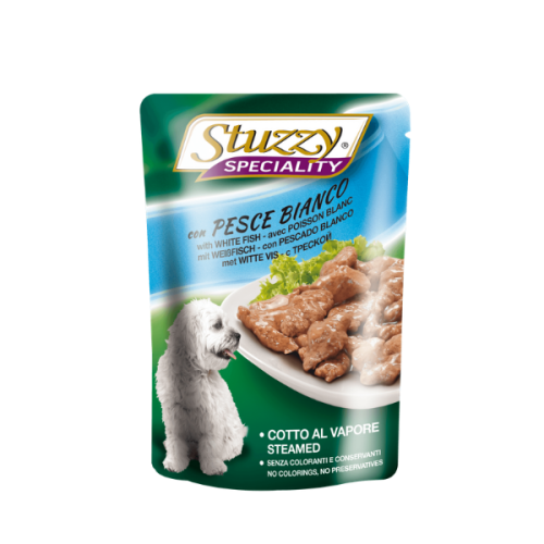 Hrana umeda pentru caini Stuzzy Adult cu peste alb 100 g cu sos pentru catei adulti cu apetit capricios. Caracteristici si beneficii hrana umeda Stuzzy: Bucatele fragede de carne in sos care contin inulina si biotina; Gatit la abur, hrana pastre..