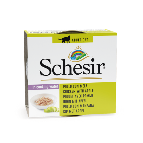 Hrana umeda pentru pisici Schesir Fruit Pui si mar 75gr – Este o hrana usor de digerat, 100% naturala ce nu contine fainuri sau derivate din carne. Caracteristici si beneficii: hrana umeda completa, special creata pentru pisici adulte.contine carne..