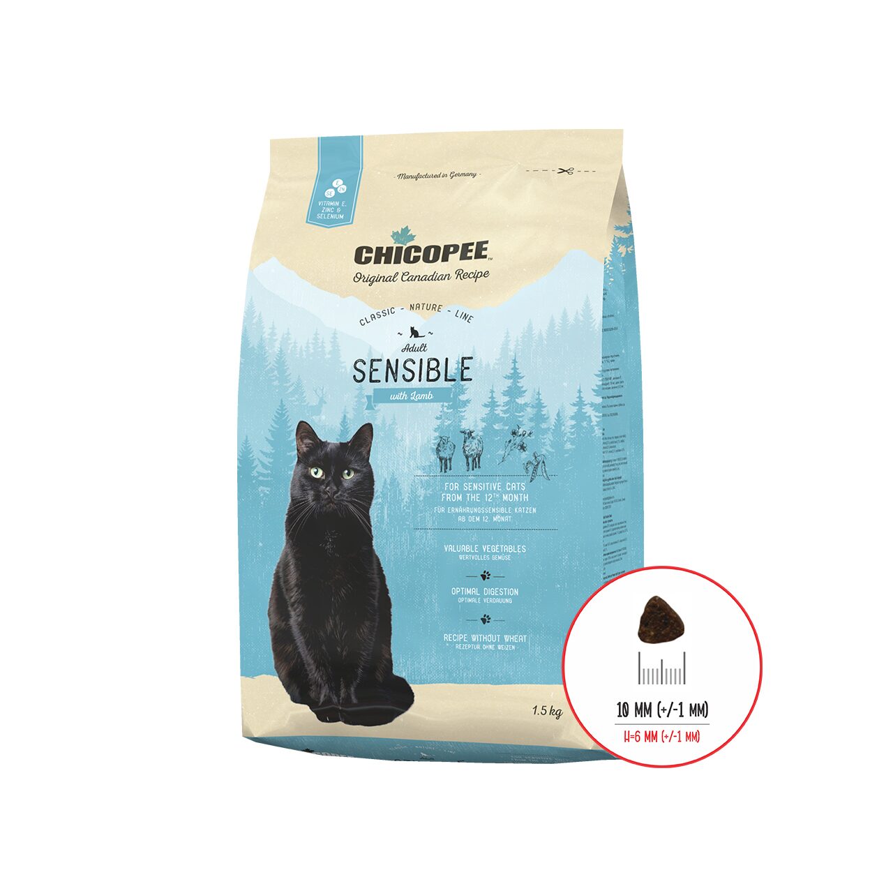 CHICOPEE CNL SENSIBLE cu miel – hrană completă pentru pisici adulte, ajută la îmbunătățirea digestiei, sănătății și longevității animalului. Această hrană este potrivită pentru pisicile domestice cu digestie sensibilă. Mâncarea din linie nu conține grâu sau gluten și aparține clasei super-premium.