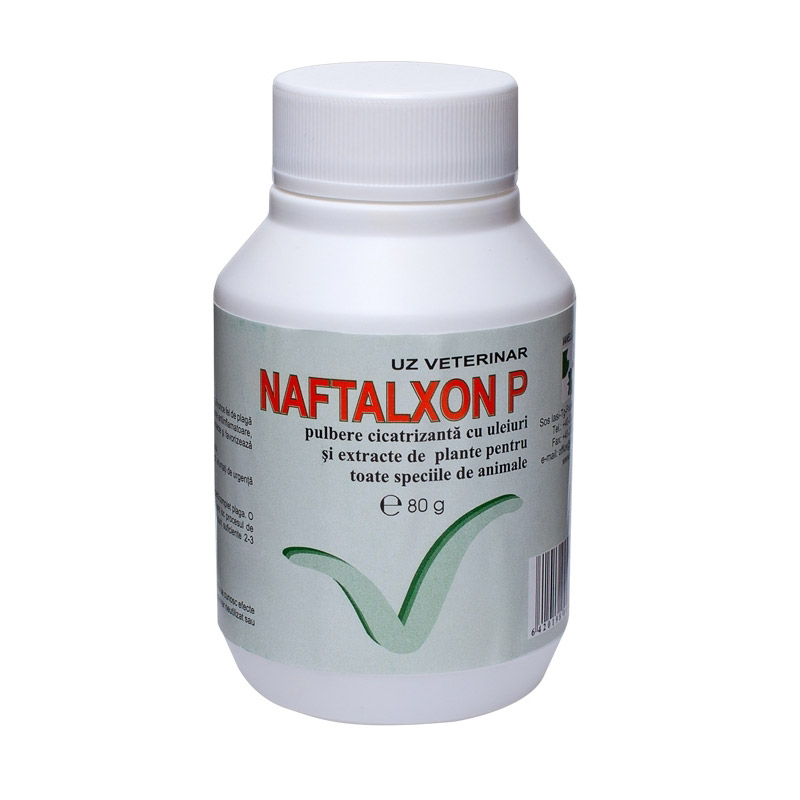 NAFTALXON P se recomandă la toate speciile de animale în plăgile de castrare dar şi în orice fel de plagă deschisă. Se recomandă de asemena în ulceraţii şi în eczeme. Pulberea, datorită conţinutului de plante are acţiune analgezică, antiinflamatoare, antiseptică, hemostatică şi ajută la regenerarea ţesuturilor. Pulberea are acţiune dezinfectantă, indepartează insectele şi favorizează formarea burjeonilor din plăgi. Talcul aderă la mucoase, punând în contact  permanent extractele de  plante cu plaga.