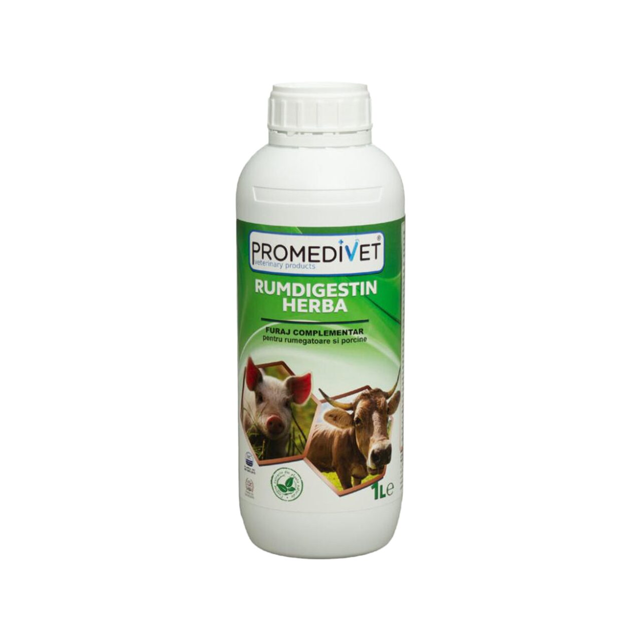 RUMDIGESTIN HERBA este un extract de plante medicinale cu proprietăți stomahice, digestive, tonic-amare, care cresc motilitatea tubului digestiv și a secrețiilor digestive, hepatice. Se recomandă folosirea la porcine și la rumegătoare mari și mici.