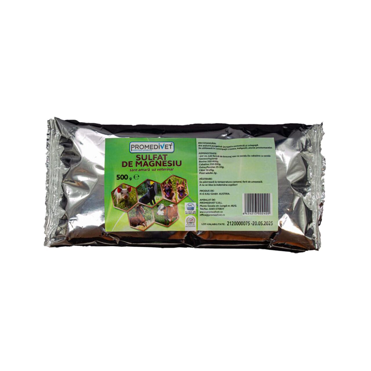 Dozaj recomandat: bovine 500-800 g, cabaline 250-500 g, ovine, caprine, porcine 25-50 g, câini 10-25 g, pisici adulte 2 g.